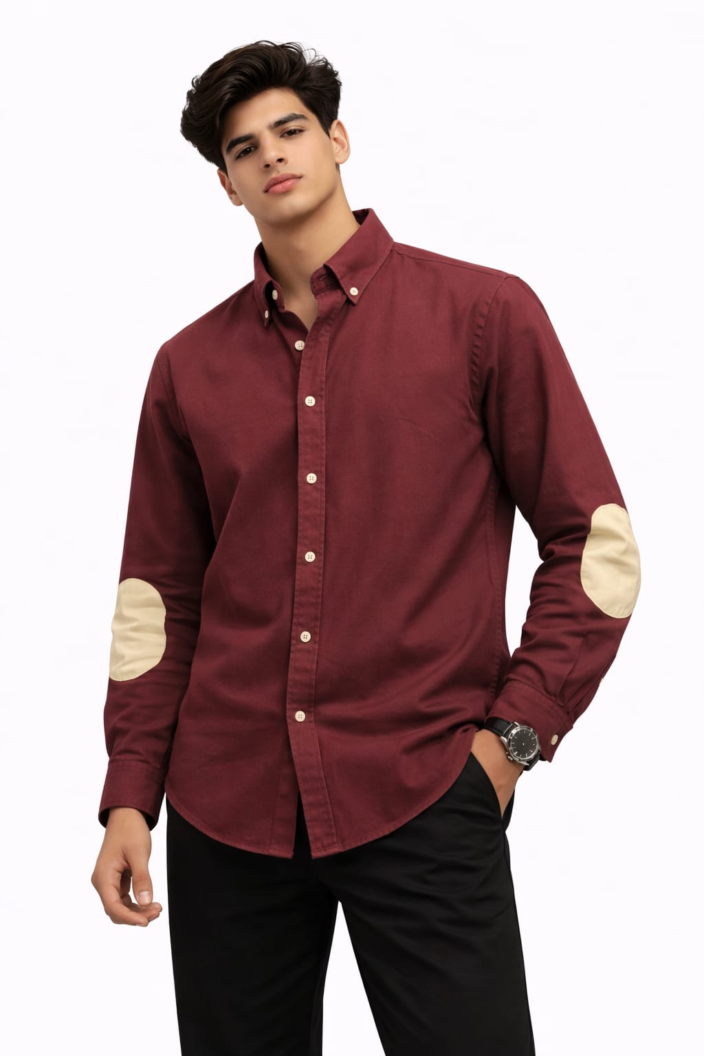 Add a bold touch to your wardrobe with this Maroon Oxford Patch Shirt, crafted from premium Oxford cotton for a perfect balance of durability and comfort. The rich maroon color gives a refined and stylish look, while the contrasting elbow patches add a modern, sophisticated detail that elevates the overall design.